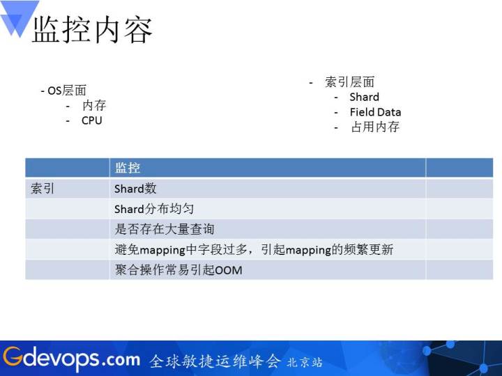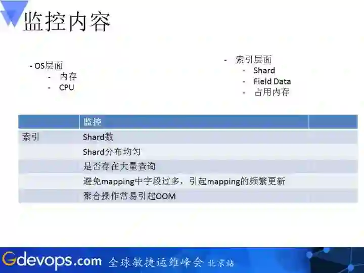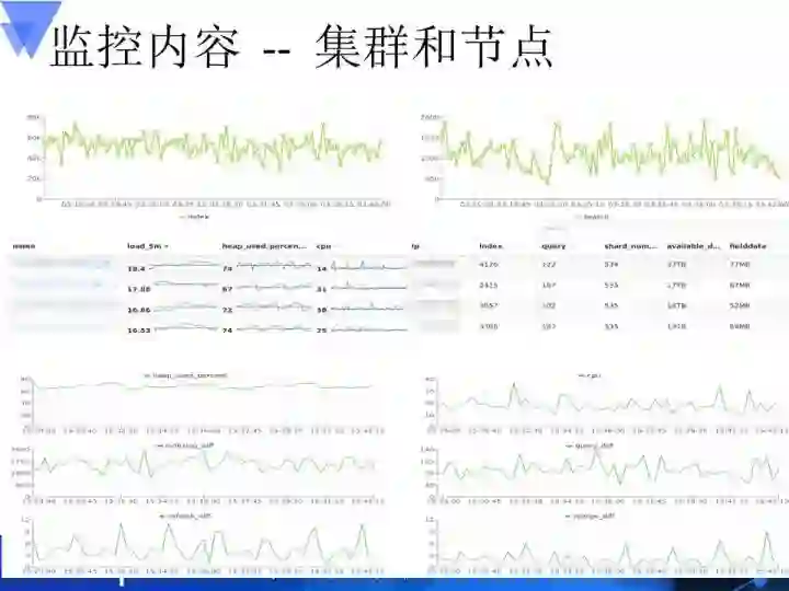 OS层面就是内存、CPU,索引层面就是分片还有它的Field Data以及其它占用的内存数。索引的话就是每个索引数设置得合理,这些分片数设置得合理与否,分片是否在每个集群里比较均匀地分布;针对每一个索引的话,它的查询量是不是过大,如果过大的话,那么整个集群也会有问题。ElasticSearch并不是一个能够很好地支持高并发查询的系统。每一个索引中包含的字段数不能过多。