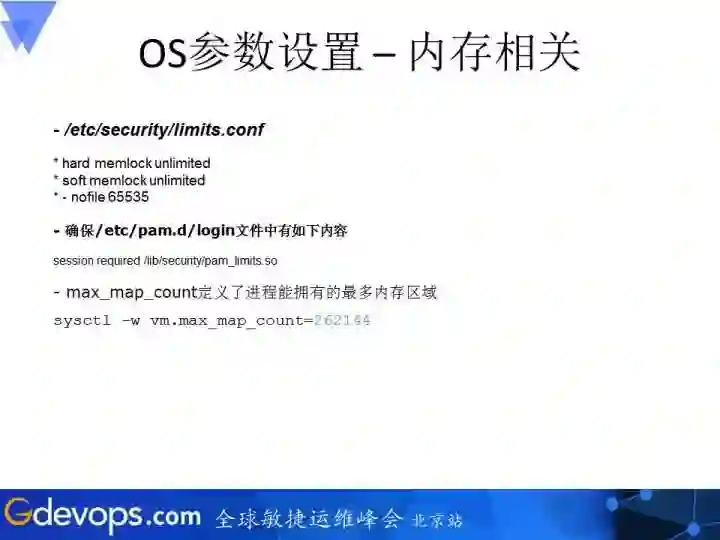 像OS这个参数设置,首先提到的是内存相关的参数,由于ES采用Mapping机制,将文件映射到内存,在系统级别有一些相关的参数要设置。另一个就是文件数,假设我们所有都设置到最大65535。