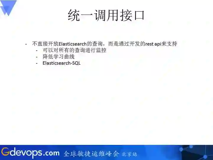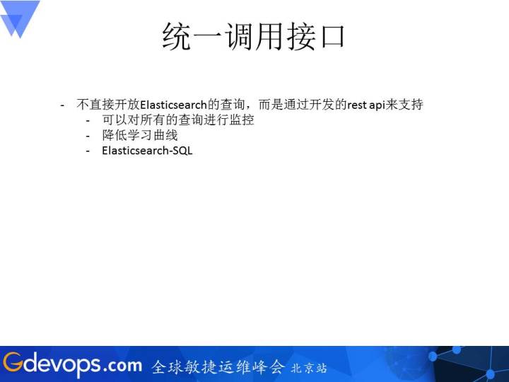 前面讲的是一些设置方面的内容,下面讲如何放开这个ElasticSearch的使用。想法跟大的原则一样,尽量避免开发人员直接调用Elasticsearch的API来操作ElasticSearch,因为这样产生的问题不容易控制,毕竟每个人对ElasticSearch的熟悉程度不一样。 建议先统一入口,在包裹之后的API对ES进行操作。 利用BigQuery API对写入到Elasticserch的数据进行查询,开发人员直接写SQL语句。如果SQL语句本身有问题的话,在Elasticsearch-SQL一侧就可以将其挡掉。