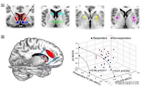 图注:(A)显示了精神外科手术干预的靶点和种子区的位置;(B)腹侧和背侧两条可分离的额叶-纹状体功能连接分别对应手术治疗的作用机制和潜在的预测因子。