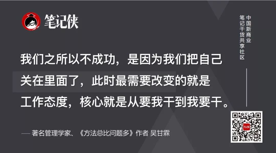 从那时起,我开始明白:其实,我们自己才是促进自己发展的金钥匙。我们之所以不成功,是因为我们把自己关在里面了,此时最需要改变的就是工作态度,核心就是从要我干到我要干。