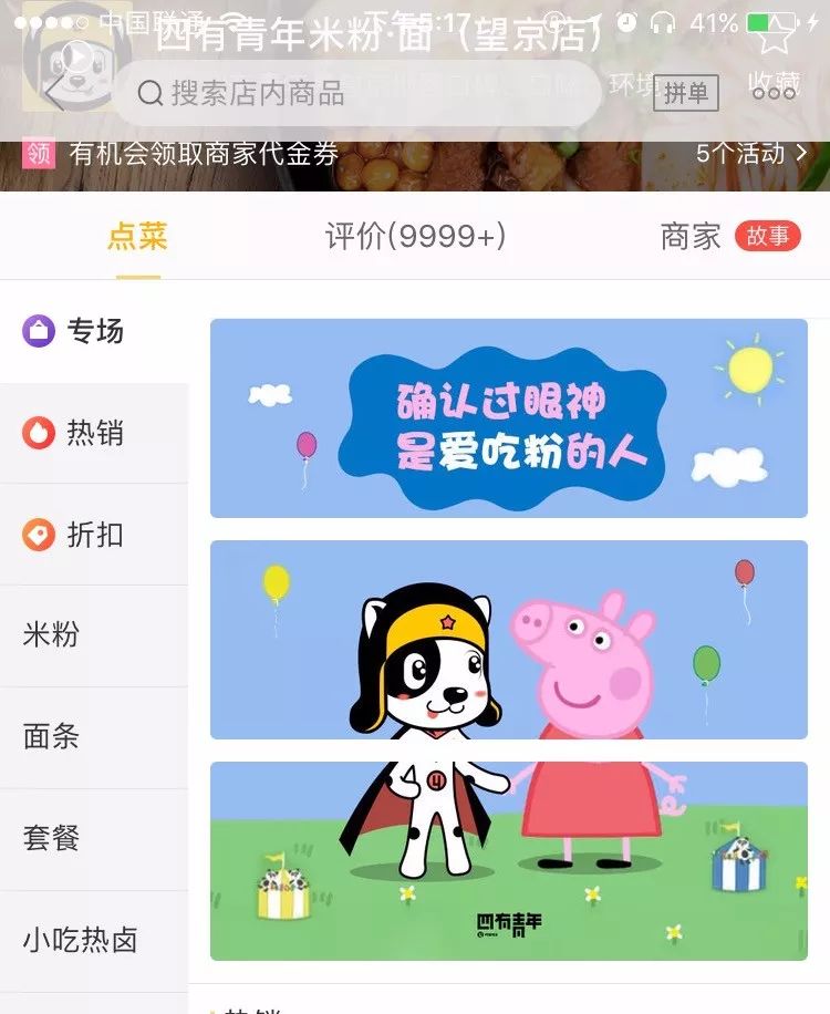 四有青年米粉·面的做法也值得借鉴:将小猪佩奇和品牌元素结合起来,挂在了店内banner上,给人眼前一亮的感觉,对品牌力的长期积淀也会起到一定作用。