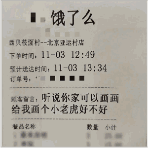 提出画画要求的顾客越来越多,外卖备注单和餐厅小票,已经成为商家的一个服务阵地,不画不行,画不好差评。