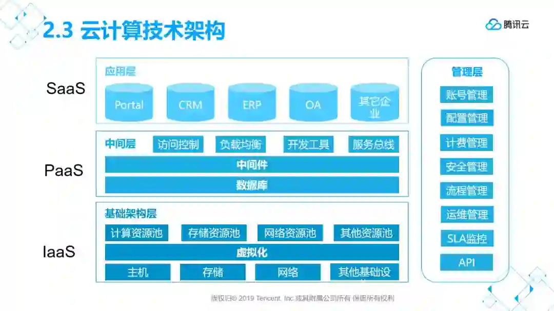比如腾讯云,既可以交付诸如虚拟机,网络,存储等基础架构资源,提供基础架构方面的服务;也可以交付诸如云数据库,人脸识别等业务应用所需的各种服务平台;当然还提供了企业办公,网络监控,数据分析等应用资源,从而更好的满足和支撑客户的业务扩张。