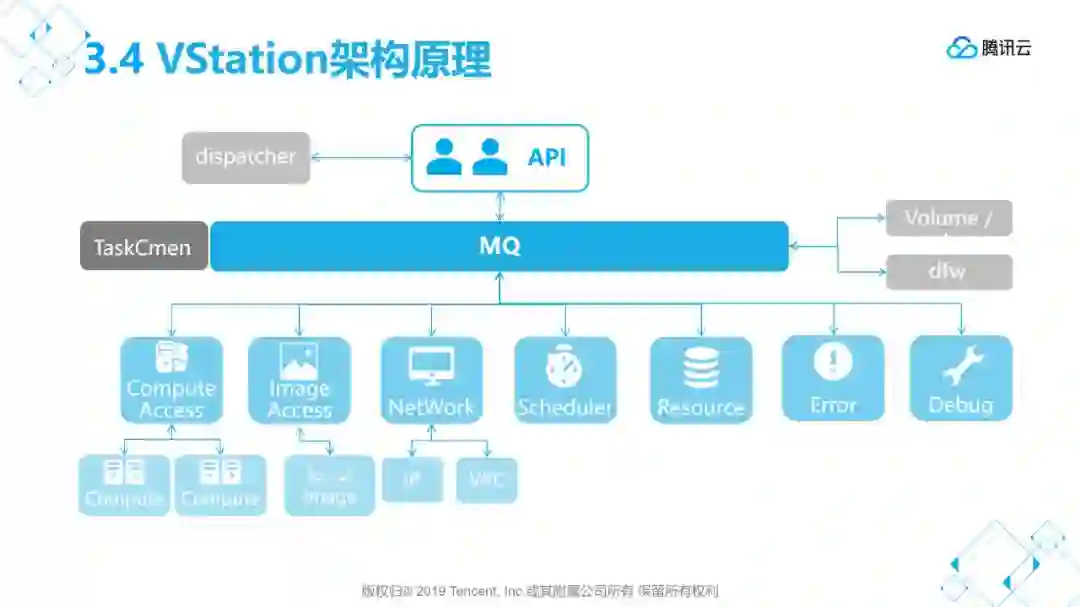 而为了解决超大规模对调度吞吐率带来的挑战,2013 年初,腾讯云自主研发的革命性虚拟化平台 VStation 全面上线。与 OpenStack 相比,VStation 支持数十万台服务器的集群规模,任一模块跨机房部署容灾,并可支持数万台虚拟机分钟级别的创建,其架构图如图所示。在 VStation 架构中存在多种模块,Scheduler 就是其中的一种模块,负责为虚拟机选择合适的宿主机。