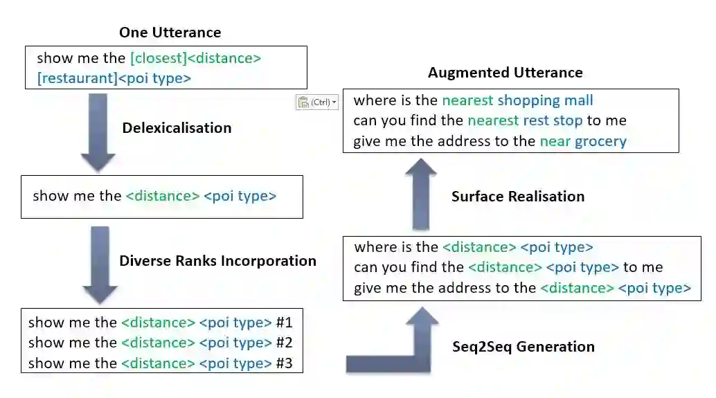 在本文中,我们研究了LU的数据增强问题,并提出了一种新的数据驱动框架,该框架利用训练数据中相同语义的语句之间的关系。Seq2Seq模型是我们框架的核心,输入一种表述的句子,生成不同表述的新句子。为了进一步鼓励多样化生成,我们把一种新的多样性等级嵌入到话语表示中。在训练seq2seq模型时,多样性等级也用于过滤相似的表述对。 提出的这些方法生成了多样的增强数据,显着提高了标记数据稀缺情况下的LU性能。