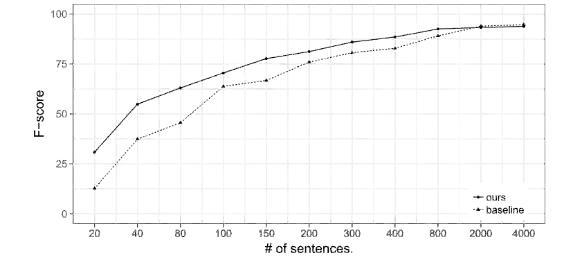 图9. 随着ATIS训练数据规模的变化,我们模型得到的F值的变化情况