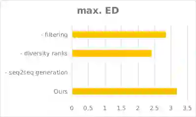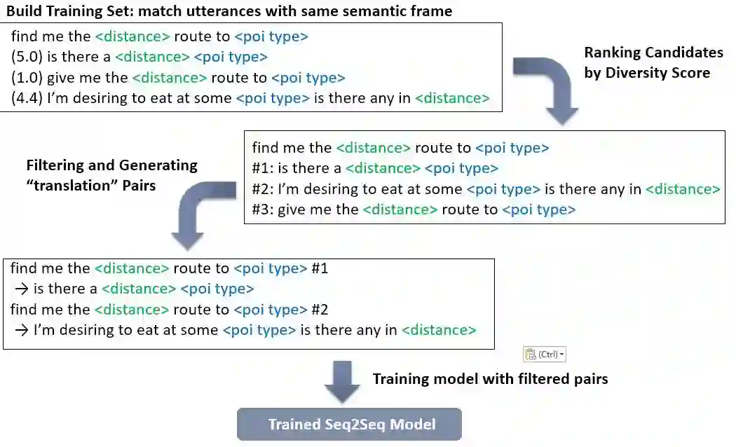 其中的seq2seq的训练流程如图2所示。我们将具有相同语义框架的句子配对,然后计算句子对的多样化分数并以此进行排序作为多样化等级。在使用多样化等级过滤掉相似的句子对后,我们把加上多样化等级的句子对送到seq2seq中进行训练。