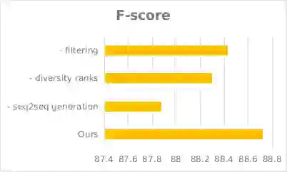 为了探究我们方法的各个组成模块的作用与贡献,我们进行了消融测试,测试结果如下图所示。除了F-score之外,我们还对比了去掉不同组成时模型生成的新语句个数、以及新语句与训练集的最小编辑距离,以反映我们模型生成多样化数据的能力。