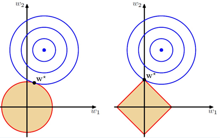 有两维,如下图。其中黄色区域分别是 L2 和 L1 约束,蓝色是 Cost Function 的等高线。蓝色与红色的切点即求出的