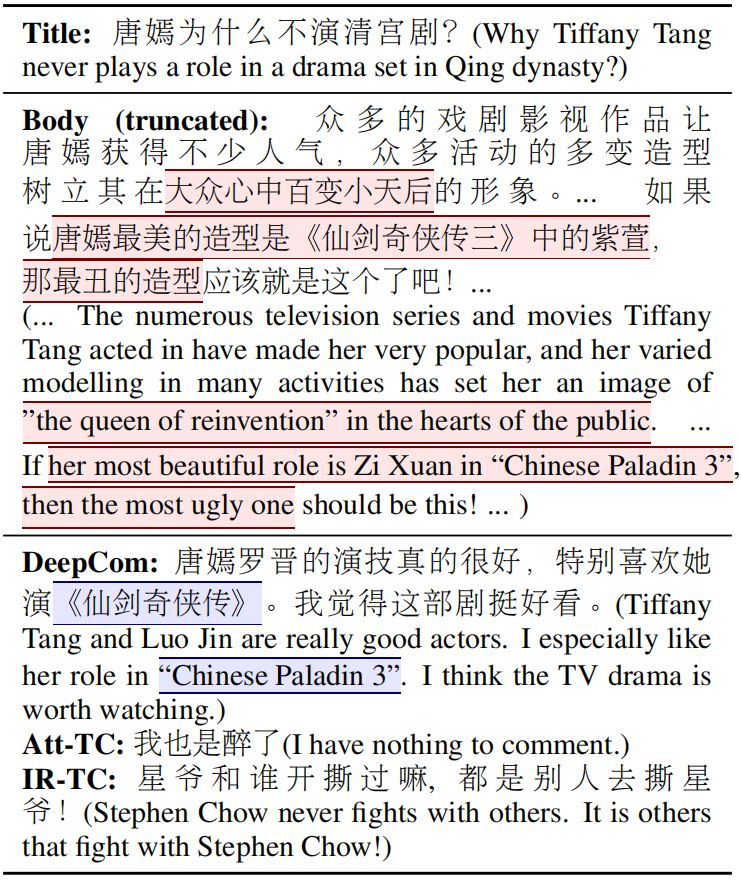 在表 7 中,作者可视化了预测的显著分段和生成评论。可以看出 DeepCom 模型发现了一些有意思的点,并且根据显著性分段生成了评论。更有趣的是,生成的评论中提到了“罗晋”,是唐嫣的丈夫,扩展了原新闻的内容,而罗晋在原新闻中并没有被提到。对比之下,基线方法给出的评论则太概括(Att-TC,最好的生成基线),或完全与新闻不相关(IR-TC,最好的检索基线)。该示例说明,DeepCom 通过分析理解新闻内容,能够生成与新闻主体相关的,且信息丰富的评论。