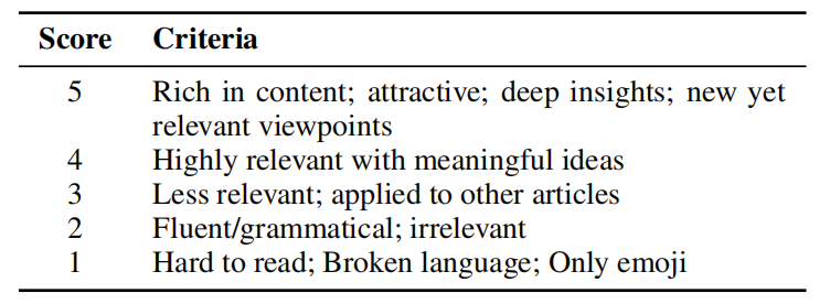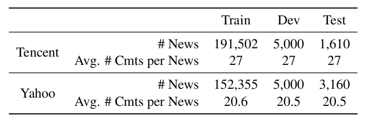 第一个数据集为腾讯新闻中搜集的中文新闻数据集。每个数据点包含一篇新闻,由新闻标题、新闻正文和一组评论组成,以及一些边缘信息,例如点赞和分类。每个测试评论都由两个标注人员根据表 3 所示的评价标准进行打分。除了中文数据,作者建立了另外一个数据库,是从雅虎新闻上搜集的新闻和评论。新闻标题、正文和评论包含的词语数量平均为 12、578 和 32 个。