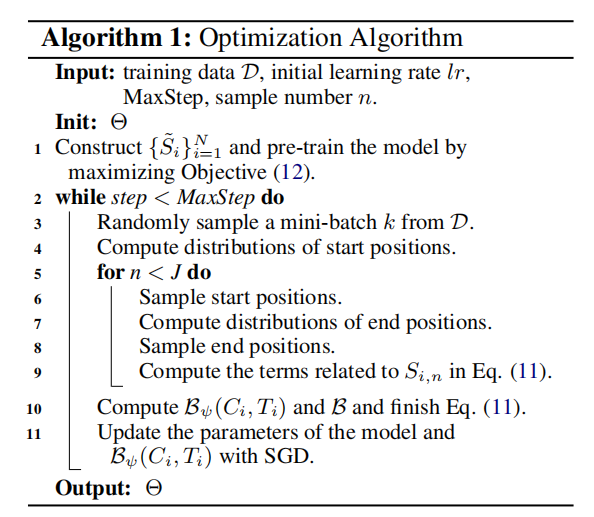 为了加快收敛,作者通过预训练阅读网络和生成网络初始化模型。对于 (Ti,Bi,Ci),作者建立了人工分段 Si,然后通过最大化如下目标函数学习这两个网络的参数: