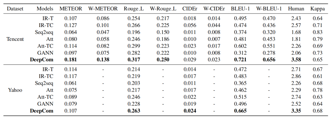 表 4 给出了自动评价指标和人工打分的结果。在大多数自动评价指标上,DeepCom 超过了基线方法,并且提升程度很高。在 BLEU-1 和 W-BLEU-1 指标上的提升程度超过了其他指标。在人工打分中,总体的打分趋势是一致的。Fleiss Kappa 系数均超过了 0.6,表明打分人员的基本意见是一致。