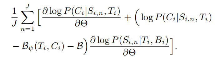Si,n 表示对分段采样的结果。尽管蒙特卡洛方法是无偏估计,但是会受到高方差的影响。为了减少方差,作者从 logP(Ci|Si,n,Ti) 中减去基线。作者引入基线 Bψ(Ti,Ci) 捕捉训练中新闻 - 评论数据对的系统差异。此外,作者也探索了全局基线 B,进一步控制估算子的方差。因此 dLi/dθ可以近似写为:
