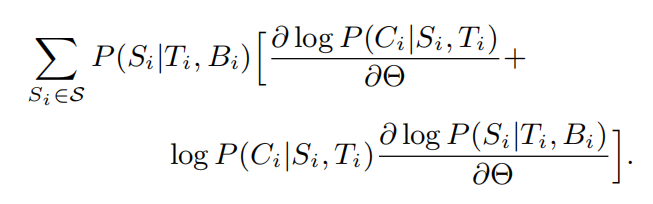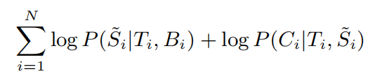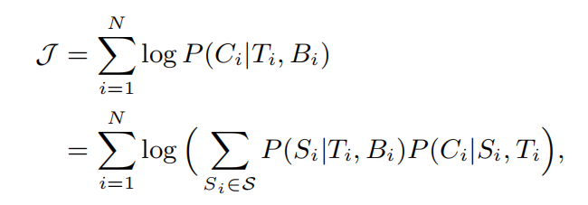 模型的目标是从 D={(Ti,Bi,Ci)}中学习 P(S|T,B) 和 P(C|S,T),但是在实际情况中,S 很难得到。为了解决这个问题,作者将 S 视为一个隐变量,然后考虑如下的目标函数: