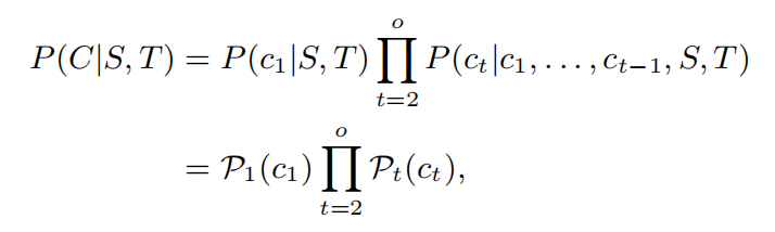假设 C=(c1,…,co) 为评论,ck 为 C 中第 k 个词在单词表中的索引,于是 P(C|S,T) 可以定义为: