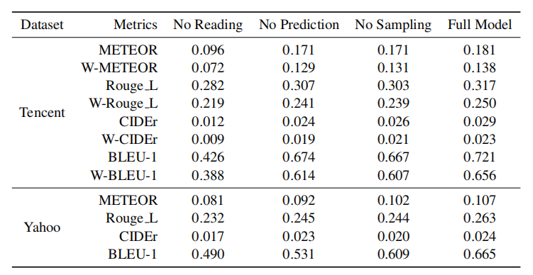 作者对比了模型的以下变体:(1)没有阅读网络:用基于 TF-IDF 的关键词提取器替代了阅读网络,将前 40 个关键词直接输入生成网络;(2)没有预测层:移除阅读网络中的预测层,将得到的新闻表示 V 直接用于生成网络;(3)没有采样:直接使用最大化目标函数预训练的模型。表 5 给出了对比实验结果。