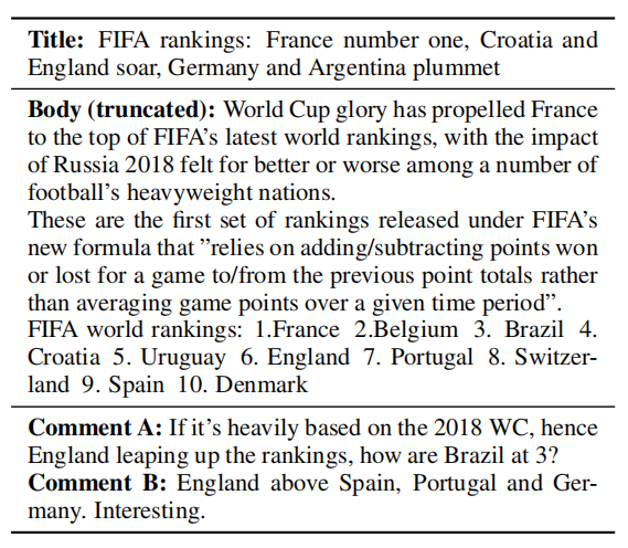 作者用雅虎新闻的一个例子说明了新闻评论的产生机制。这篇新闻报道的是国际足联的新排名,作者从众多评论中挑选了两条评论来解释人们是如何进行评论的。首先,这两位评论者都浏览了整篇文章,因为他们的评论是建立在正文中的细节之上的。其次,文章给出了关于新排名的许多细节,但两位评论者都只评论了几点。第三,两位评论者的关注点不同:第一位评论者注意到排名是基于新世界杯的结果,对巴西的位置感到好奇;第二位评论者只是对英格兰的新位置有兴趣。这个例子说明新闻评论是通过 “阅读 - 关注 - 评论”这一过程而产生的,作者受此启发,构建了自动生成新闻评论的模型 DeepCom。