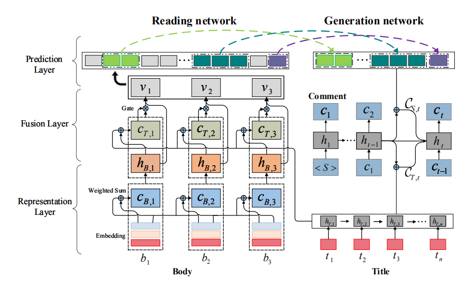 为了模仿“阅读 - 关注 - 评论”的过程,作者提出了一个阅读网络和一个生成网络。阅读网络模拟人们理解新闻文章,作为新闻的编码器。生成网络模拟人们在阅读新闻后如何评论新闻,作为评论的解码器。阅读网络从下到上由表示层、融合层和预测层组成。
