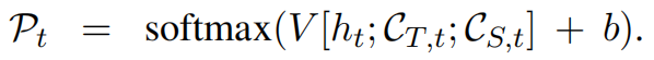 有了 ht,可以通过 att(HT,ht) 和 att(HS,ht) 计算得到 CT,t 和 CS,t,然后得到单词表的概率分布:
