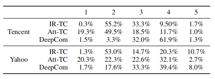 从表 6 中可以看出,IR-TC 的大部分评论得分都为 2 分,说明尽管 IR-TC 生成的评论信息丰富,但是容易偏离新闻主题,所以被评价为“不相关的”。在 Att-TC 生成的评论中,1 分评论所占的比例远高于其他两个模型,说明 Att-TC 容易生成有语法错误的句子。这是由于新闻文章和评论是高度不对称的,因此不能简单地用编码器 - 解码器的结构建模生成过程。而 DeepCom 生成的评论中,负面分数大部分为 3 分,说明需要进一步丰富评论内容,并且提升评论的相关性。