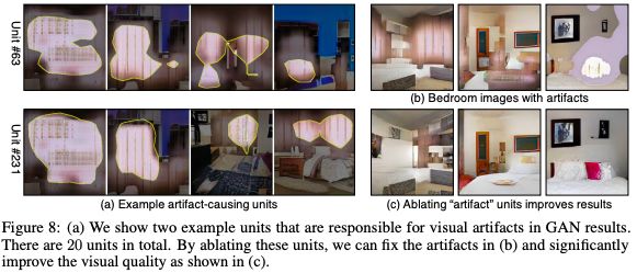如图8所示,图8a显示了几个注释单元,负责GAN结果中的visual artifacts;图8b显示了artifacts被成功移除,并且自由像素保持不变的改进的生成结果。