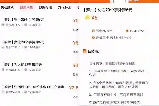 打开龙猫众包App,可以在「数据采集」任务栏下看到多个任务,有男性20个手势赚6元、老人的现在和过去赚3元、拍汽车内吸烟照片赚6.3元等,点进去会有每项任务的详情要求,对照片背景和人物姿态都有规定。新经济100人试验了几项任务,一两天左右就有审核结果出来。