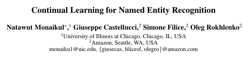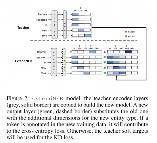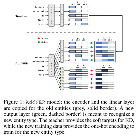 在许多真实任务下,常常需要引入新的实体类型,因此需要重新训练命名实体识别模型。当因为存储或安全问题限制对原始数据的访问时,那么为新实体类型重新标注原始数据的成本将会是高昂的。而现有的持续学习方法又很容易出现灾难性遗忘问题(catastrophic forgetting)。因此作者提出通过蒸馏学习保留先前学习的现有知识,使原模型指导新模型学习新的实体类型的持续学习方法。在CoNLL-03数据集和OntoNotes数据集上实验表明,该方法允许模型渐进地能学习新的实体类型,还能保留先前学习的知识。