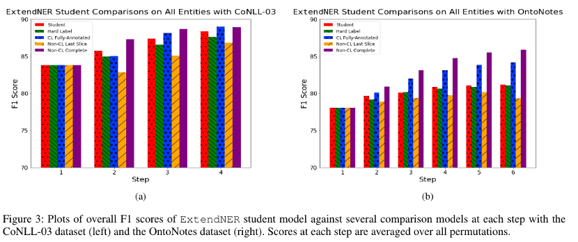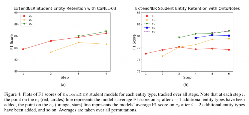 为了研究这个问题,作者逐步跟踪模型在其学习实体类型上的结果。结果如图4所示总体而言,F1得分保持不变或者逐步增加。这表明,随着引入新的实体类型,该方法不仅能学习到如何标注新的实体类型,还能保留先前学习的知识。