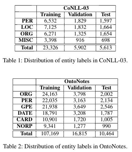 作者采用了2个公开数据集进行实验,分别是CoNLL-03数据集和OntoNotes数据集,见表1和表2。模型的评价指标为准确率、召回率和F1。