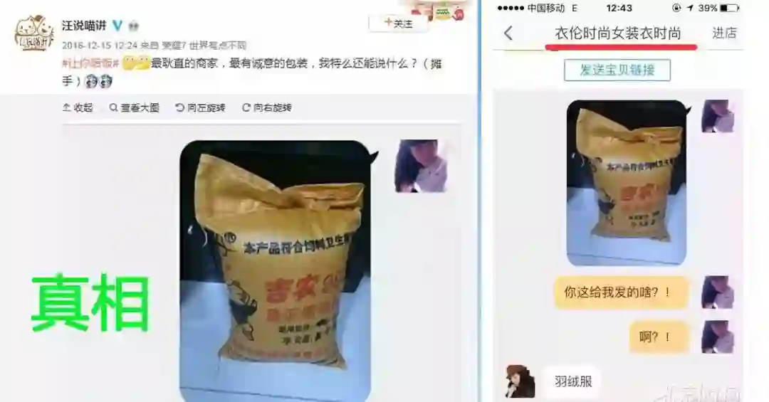 通过溯源,这张图片最早的痕迹是2016年12月15日8点7分,界面新闻文章《现在的包装真是没救了》。微博主“汪说喵讲”于当日12时24分进行了转发,使用的标题是“#让你喷饭#最耿直的商家,最有诚意的包装,我还能说什么”。