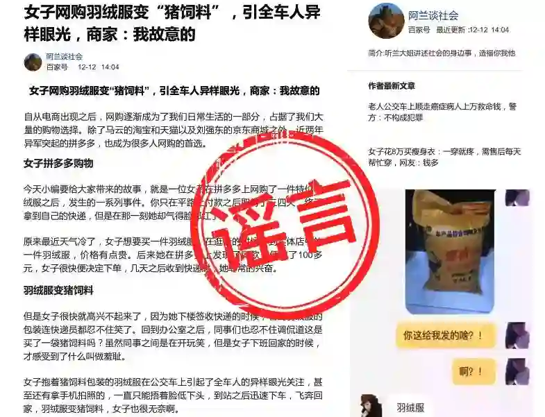 故事称一女子在拼多多上购买羽绒服,卖家却用猪饲料袋子包装寄出,抱着猪饲料快递包回家,姑娘一路上无比尴尬和羞耻。但事实是,在全平台进行了查找,也没有找到文中所说名为“衣伦时尚女装”的商家和商品。