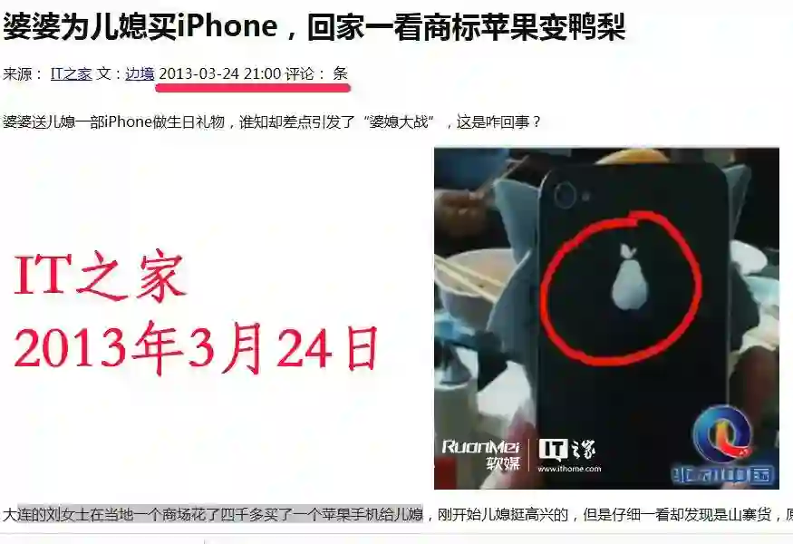 苹果手机变“梨子手机”,这种段子似曾相识。仔细一查, IT之家早在2013年3月就刊登过了这一图片,文章标题叫做《婆婆为儿媳买iPhone,回家一看商标苹果变鸭梨》。