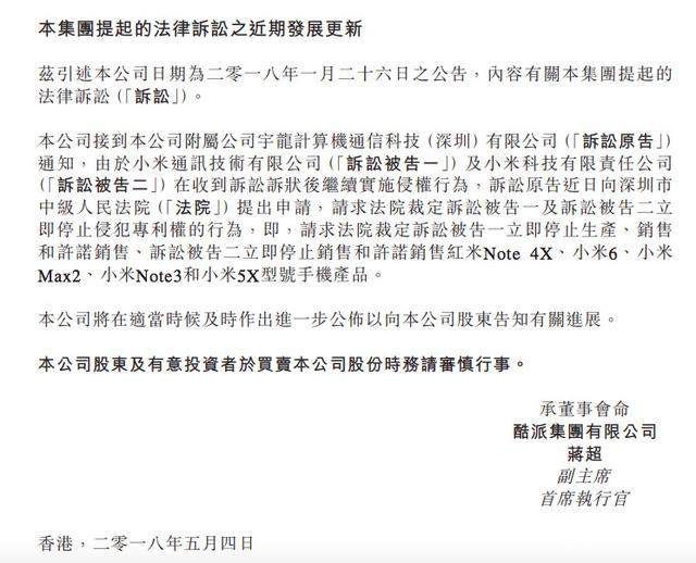近日国产手机老牌厂商酷派公司宣布,对小米科技有限公司侵犯其多项发明专利提起侵权诉讼和行政处理请求,目前已向深圳市中级人民法院提出申请裁定被告停止侵犯专利权的行为。
