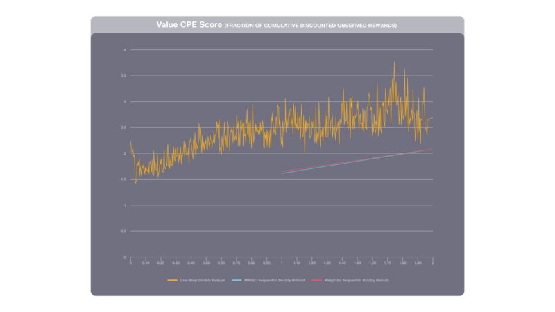 反事实策略评估为在离线环境中部署 RL 模型的工程师提供了见解。这个图比较了几种 CPE 方法和日志策略(最初生成训练数据的系统)。得分 1.0 意味着 RL 和日志策略在性能上是匹配的。这些结果表明,RL 模型的累积奖励大约是日志系统的两倍。