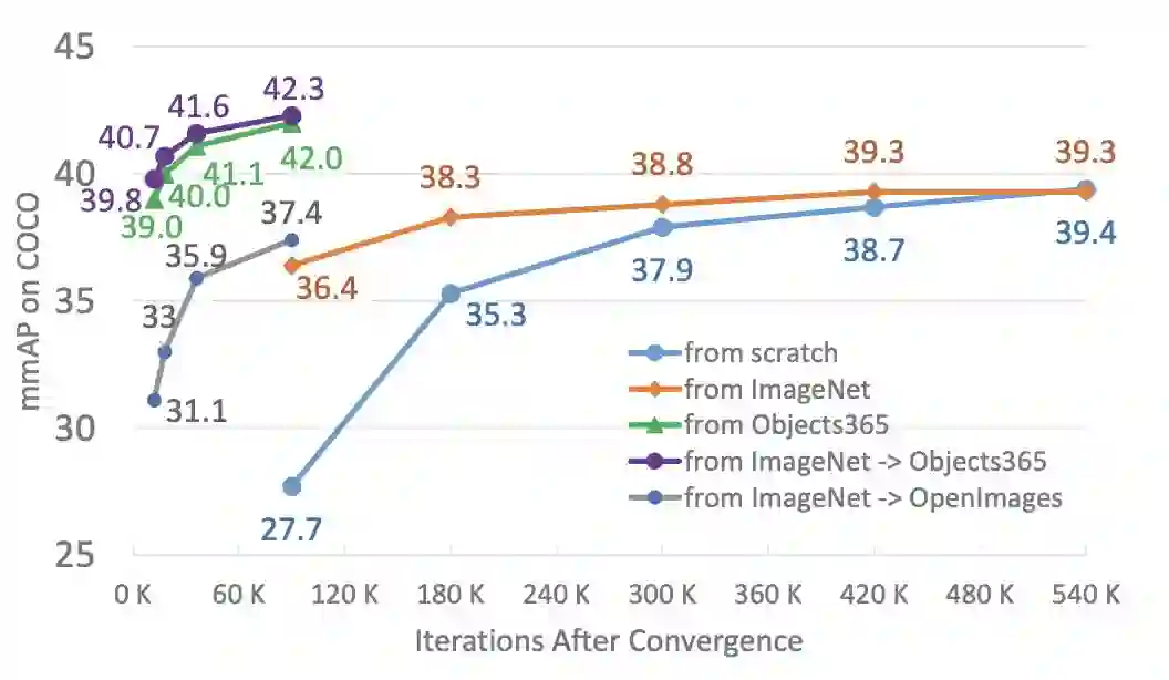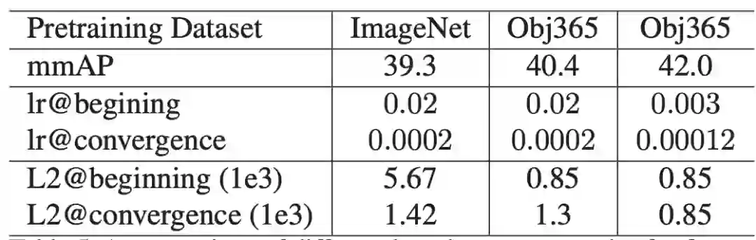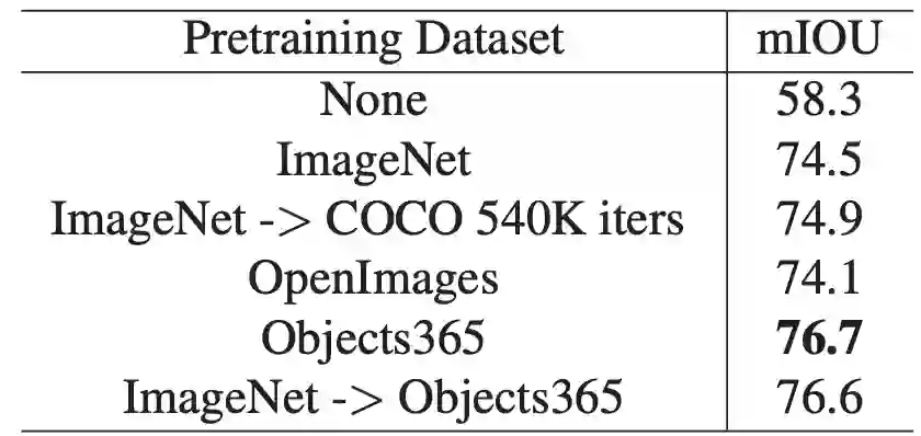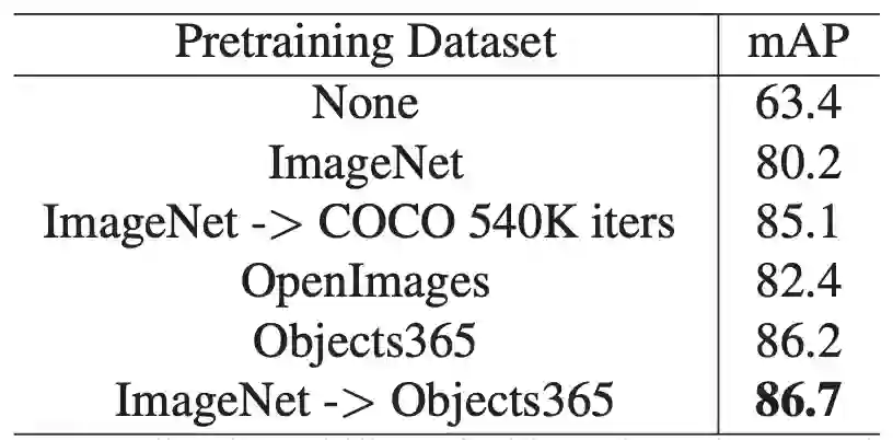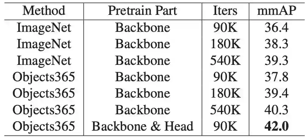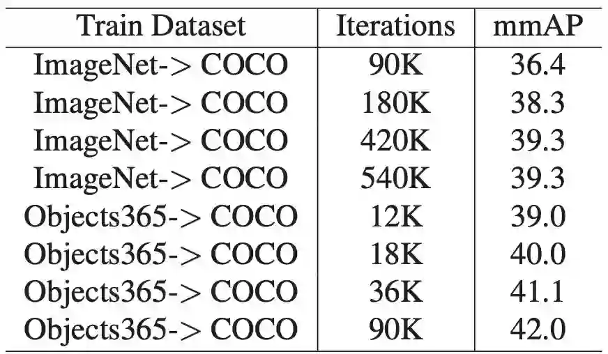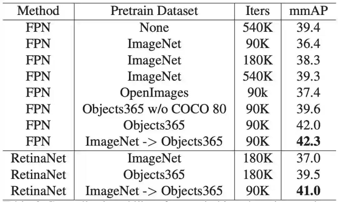 此外,利用Objects365特征,可以在一个数量级的训练时间内获得类似的结果。