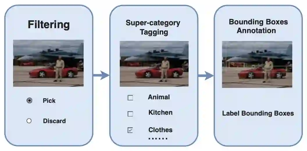第一步执行两类分类。如果图像是非标志性的,或者在11个超级类别中至少包含一个目标实例,那么它将被传递到下一个步骤;在第二步中,包含11个超级类别的图像级标记将被标记,可以用多个标签标记图像;在第三步中,将分配一个注释器将目标实例标记在一个特定的超级类别中。属于超级类别的所有目标实例都应与目标名称一起用边框标记。