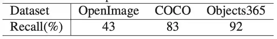 为了验证Objects 365数据集的质量,三个训练有素的注释者被要求对200个随机选择的图像进行标记。总共有3250个边框,基于注释器的细化。92%的实例在原始注释中进行注释。注释回忆与CoCO和OpenImage的比较见下表。