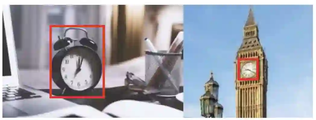 注释器必须覆盖最大的边框,这不会导致定义目标类别的模糊性。例如,我们需要将时钟的装饰部分包含在上图左边图形中,因为装饰部分属于时钟,不会导致对目标类别的误解。对于上图中的右边图形,注释器需要标记小的边界框,因为时钟的外部区域将导致另一个类别为“塔”。