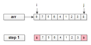 第一步:比较i与j位置的元素,根据排序规则决定是否进行置换。