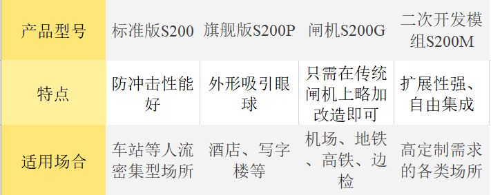团队研发出“人脸+活体+虹膜”多模态高精度生物特征识别产品。现阶段的产品包括:标准版设备S200、旗舰版设备S200P、闸机S200G和二次开发模组S200M。