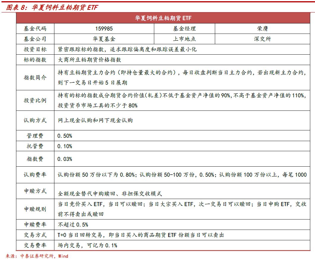 华夏饲料豆粕期货ETF是唯一的单品种期货ETF,标的指数持有豆粕主力合约,并在新主力合约出现后进行5日展期。