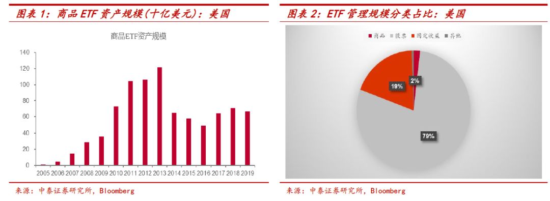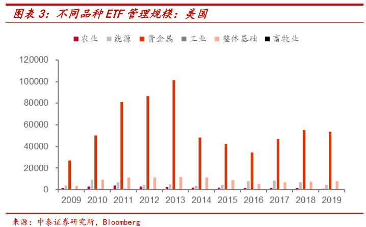 以国外成熟ETF市场美国为例,商品ETF资产的管理规模整体有了大幅的上涨,目前管理规模在600亿美元左右,但是相比其他类资产,商品ETF的占比仍比较小,目前只有2%左右。