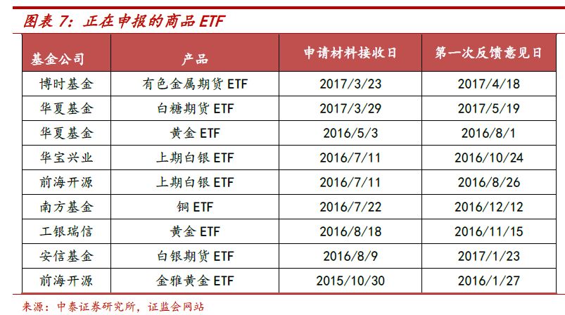 此外有不少尚在申报的商品ETF,品种包括铜、白糖、白银和黄金等。