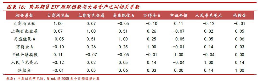 商品期货ETF具有长期配置价值,商品指数与股、债、货币和黄金等大类资产间的相关性低,可提供额外的风险分散功能。