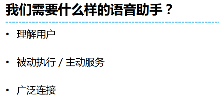 其中理解用户是指理解用户的偏好、使用历史、当前情景;主动服务则是指合适的时间做合适的事,比如:电影开始前的提醒;广泛连接是指最终语音交互不能局限于某个设备,而会连接多种设备,多种服务。针对这点三角兽的马宇驰在圆桌环节专门做了补充:语音交互其实也并不局限于语音,在某些场景下用户也还是会直接输入文字,用NUI