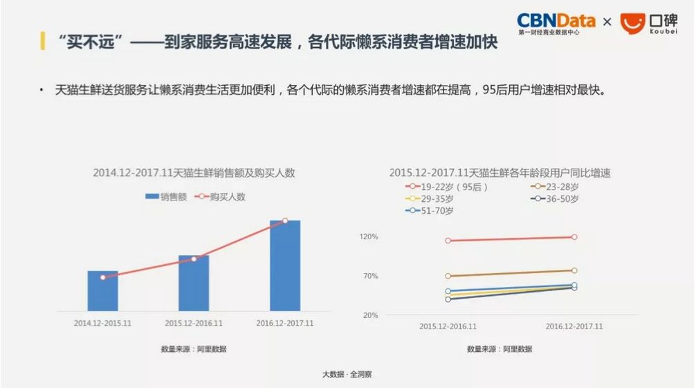 加上生鲜食品的送货上门服务,让日常的消费生活越来越便利,不同年龄层的消费者都趋向于“懒”系生活,其中95后用户变化最明显。
