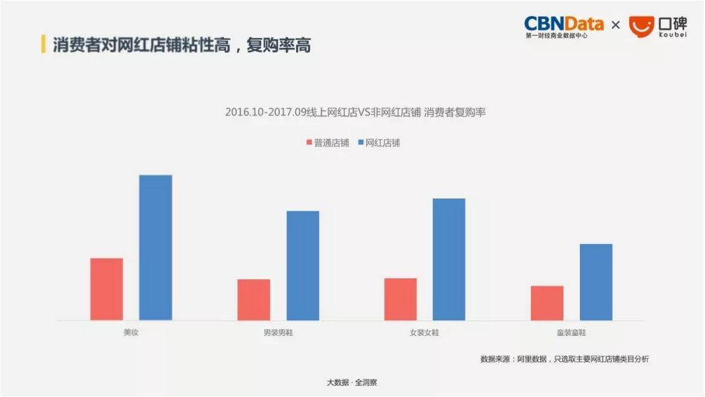 而根据线上网红店数据显示,在美妆、服饰鞋履方面,消费者对网红店铺保持粘性,复购率高。