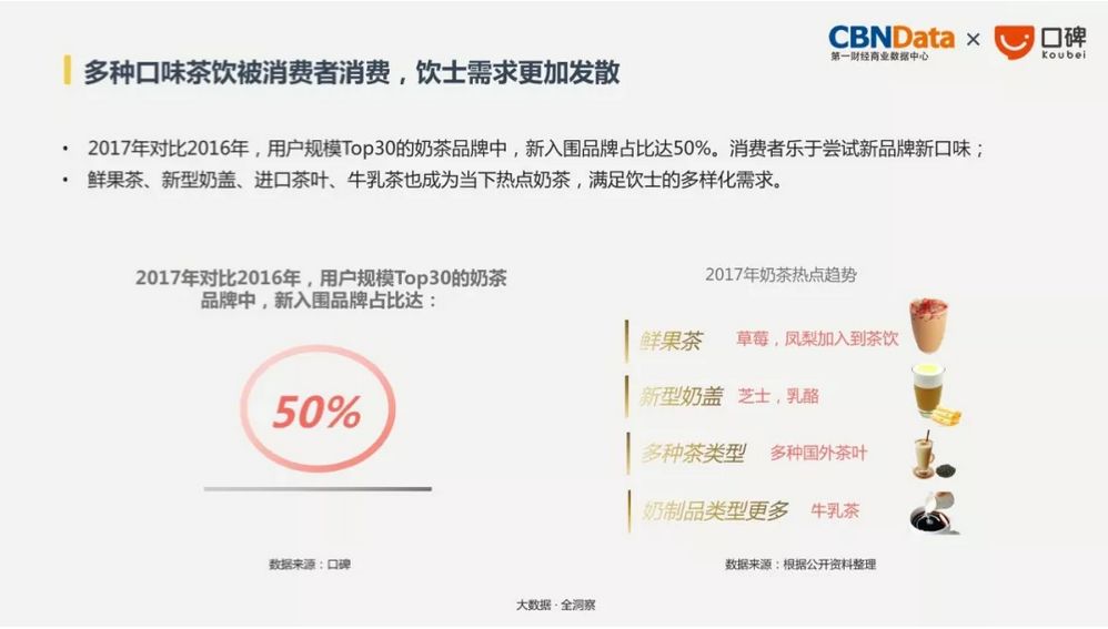 传统单一的珍珠奶茶已经远远无法满足消费者,如今已经演变成鲜果茶、新型奶盖、进口茶叶、牛乳茶多口味、多风格的产品更受欢迎。